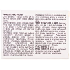 Pharmacodynamics. The patented hibiscus extract, which determines the pharmacological properties of the drug, is a source of organic acids (citric, succinic, pyrocatechin, hibiscus), vitamins, polysaccharides, bioflavonoids, which determine the bacteriostatic effect of the drug Aflazin against most pathogens of urinary tract infections (staphylococcus spp., streptococcus spp., enterococcus faecalis, escherichia coli, enterobacter spp., candida spp., etc.). It has anti-inflammatory, anti-edematous effects, exhibits an anti-adhesive effect, which makes it impossible for microorganisms to adhere (stick) to the walls of the urinary tract, their development and reproduction. Prevents the development of dysuric phenomena.