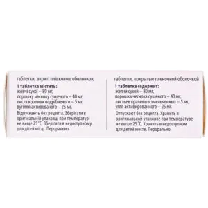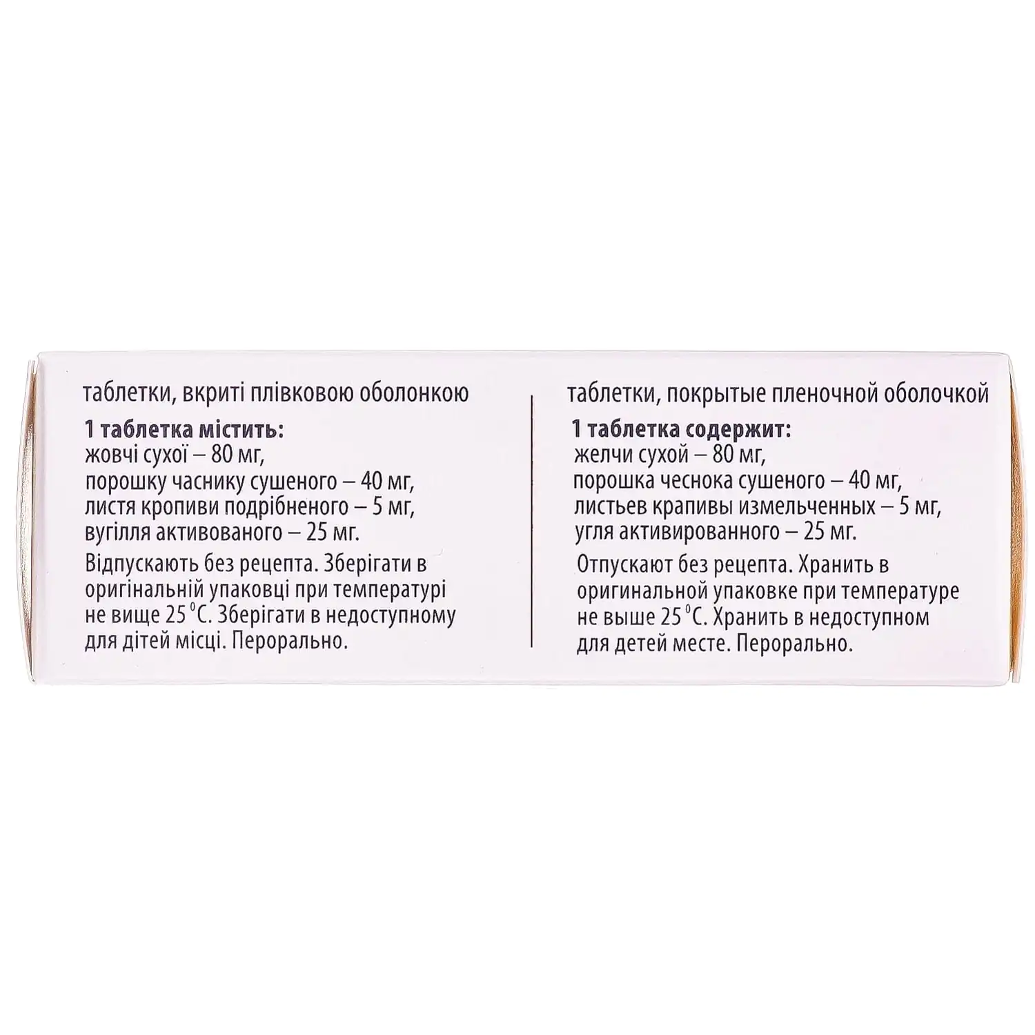 - active substances: 1 tablet contains dry galls (in terms of dry matter and quantitative content of cholic acid) – 80 mg, dried garlic powder (Allii sativi bulbi rylvis) – 40 mg, crushed nettle leaves (Urticae Folium) – 5 mg, activated carbon – 25 mg;