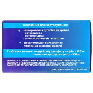 Chondroitin sulfate is a high-molecular mucopolysaccharide that participates in the construction of the main substance of cartilage and bone tissue. Improves phosphorus-calcium metabolism in cartilage tissue, inhibits enzymes that disrupt the structure and functions of joint cartilage, inhibits the processes of cartilage degeneration. Stimulates the synthesis of glucosaminoglycans, normalizes the metabolism of hyaline tissue, promotes the regeneration of the surface of cartilage and the joint capsule. Has analgesic properties, reduces joint pain, pain at rest and when walking, and manifestations of inflammation. Glucosamine hydrochloride has chondroprotective properties, reduces the deficiency of glycosaminoglycans in the body, participates in the biosynthesis of proteoglycans and hyaluronic acid. Due to its tropism for cartilage tissue, glucosamine hydrochloride initiates the process of sulfur fixation during the synthesis of chondroitin sulfate acid. Glucosamine hydrochloride selectively acts on articular cartilage, is a specific substrate and stimulator of the synthesis of hyaluronic acid and proteoglycans, inhibits the formation of superoxide radicals and enzymes that cause damage to cartilage tissue (collagenase and phospholipase), prevents the destructive effect of glucocorticoids on chondrocytes and disruption of glycosaminoglycan biosynthesis caused by nonsteroidal anti-inflammatory drugs.