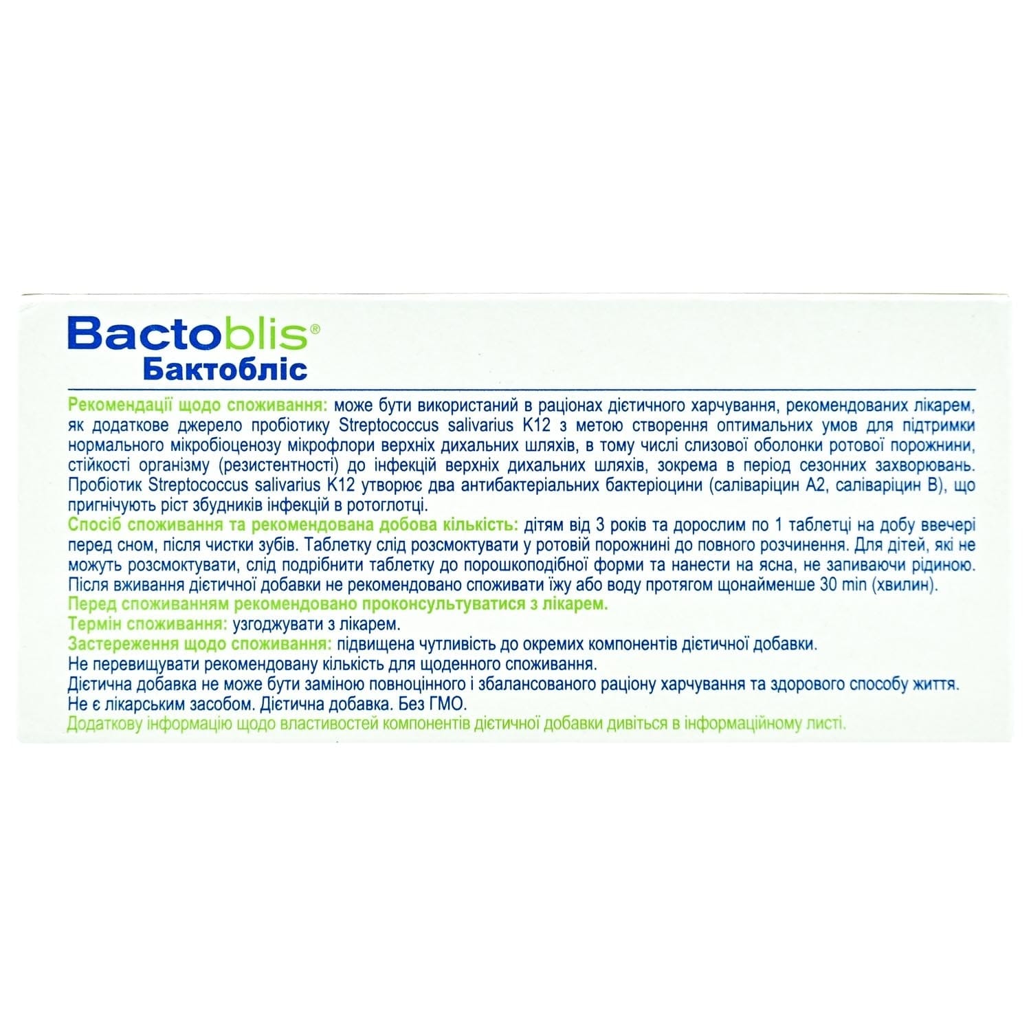 Bactoblis oral probiotic supports healthy oral and upper respiratory microflora, prevents infections, bad breath, and strengthens mucosal defense.