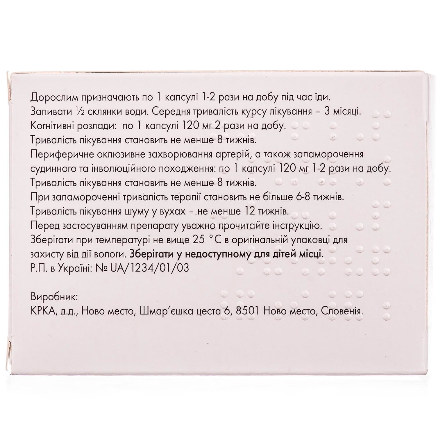 Peripheral arterial occlusive disease, as well as dizziness of vascular and involutional origin: prescribe 1 capsule of 120 mg 1 time per day. The duration of treatment is at least 8 weeks.