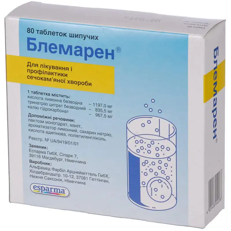 Pharmacodynamics. When dissolving effervescent tablets of Blemaren in water, potassium-sodium hydrocitrate is formed and carbon dioxide is released. This forms residual alkaline ions that are excreted by the kidneys. Thus, the pH of the urine increases (depending on the dose, it is neutralized or alkalized). This increases the degree of dissociation and at the same time the degree of dissolution of uric acid and cystine. Confirmation of litholysis of uric acid stones is performed by X-ray.