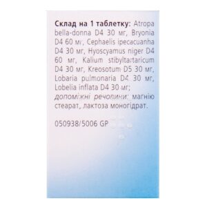 Active ingredients: Atropa bella-donna (Atropa belladonna) D4 30 mg, Sticta (Sticta) D4 30 mg, Tartarus stibiatus (Tartarus stibiatus) D4 30 mg, Kreosotum (Kreosotum) D5 30 mg, Ipecacuanha (Ipecacuanha) D4 30 mg, Lobelia inflata (Lobelia inflata) D4 30 mg, Bryonia cretica (Bryonia cretica) D4 60 mg, Hyoscyamus niger (Hyoscyamus niger) D4 60 mg;