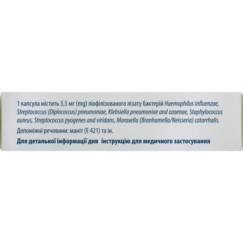 active ingredients: 1 capsule contains 3.5 mg of lyophilized lysate of bacteria Haemophilus influenzae, Streptococcus (Diplococcus) pneumoniae, Klebsiella pneumoniae and ozaenae, Staphylococcus aureus, Streptococcus pyogenes and viridans, Moraxella (Branhamella/Neisseria) catarrhalis;