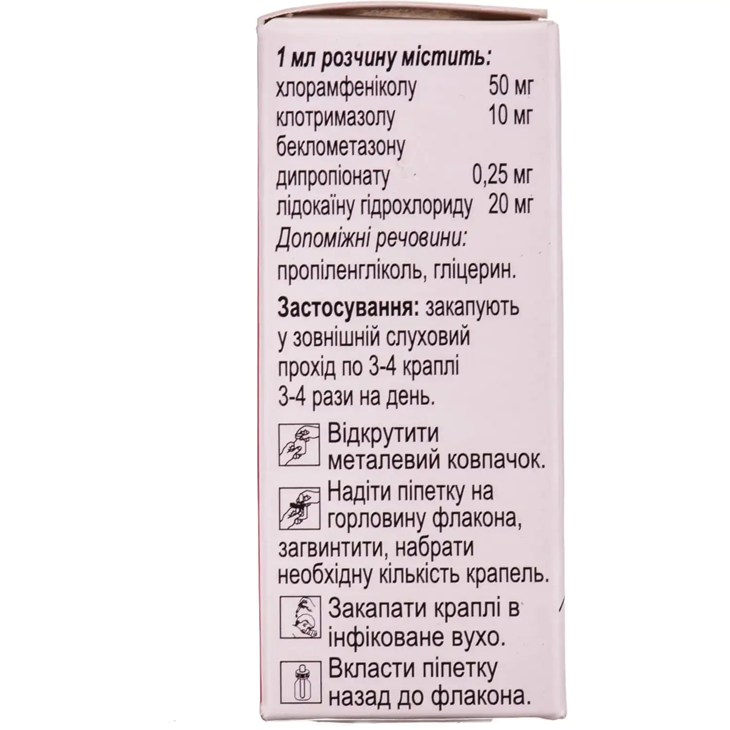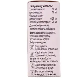 - 1 ml of solution contains chloramphenicol 50 mg, clotrimazole 10 mg, beclomethasone dipropionate 0.25 mg, lidocaine hydrochloride 20 mg;