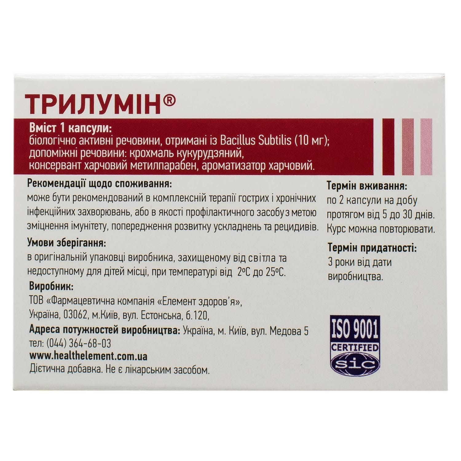 Sensitivity to the product components, autoimmune diseases (rheumatoid arthritis, systemic lupus erythematosus, autoimmune thyroiditis, etc.), use in women during pregnancy, lactation and childhood. Do not exceed the recommended daily dose, combine with immunomodulatory drugs (due to the unpredictability of the interaction). Do not drink alcohol while taking Trilumin, as it may reduce the effectiveness of Trilumin. Trilumin does not affect the ability to drive or use other mechanisms.