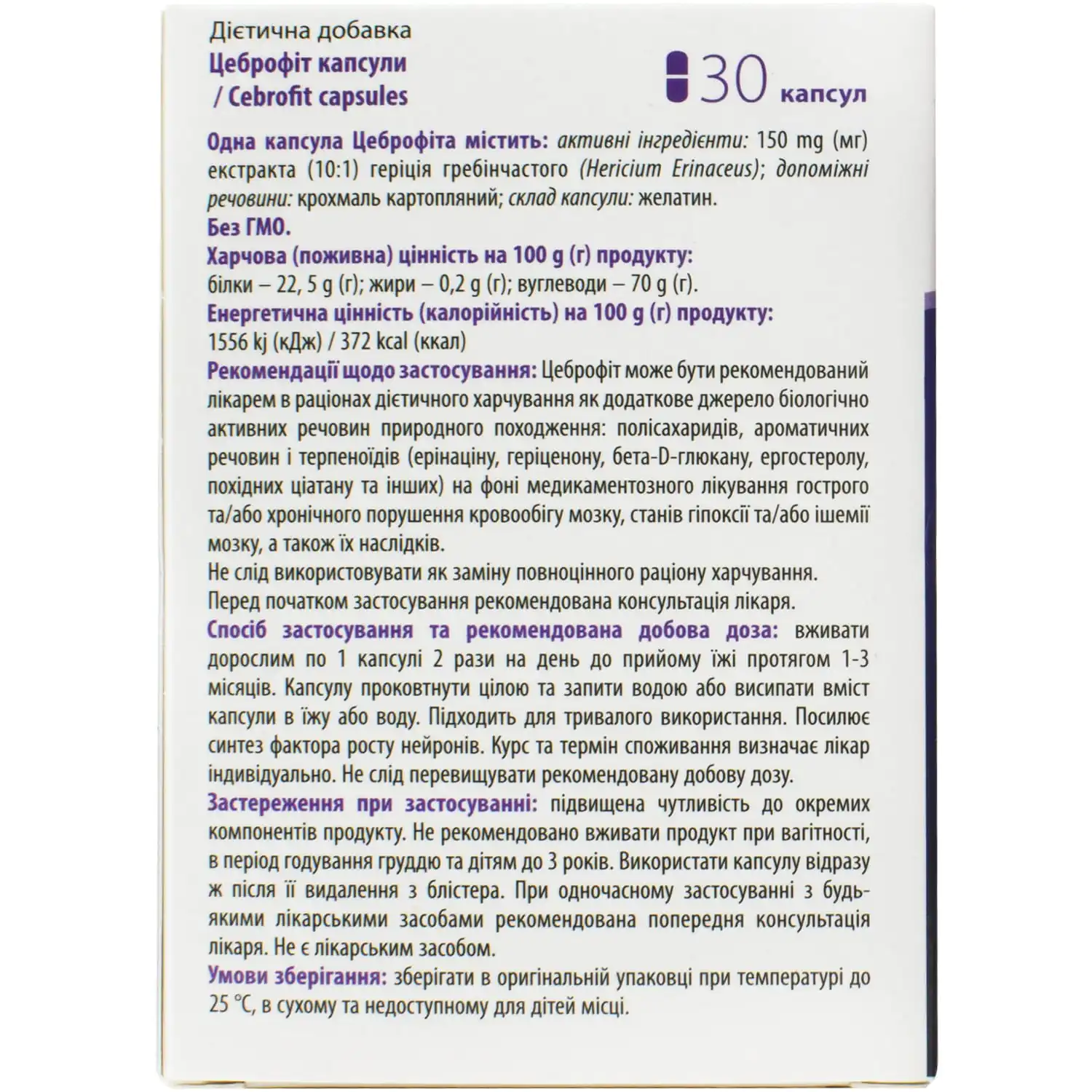 Cebrophyte can be recommended by a doctor in dietary nutrition rations as an additional source of biologically active substances of natural origin: polysaccharides, aromatic substances and terpenoids (erinacin, hericenon, beta-D-glucan, ergosterol, cyanide derivatives and others) against the background of drug treatment of acute and/or chronic cerebral circulatory disorders, states of hypoxia and/or cerebral ischemia, as well as their consequences.