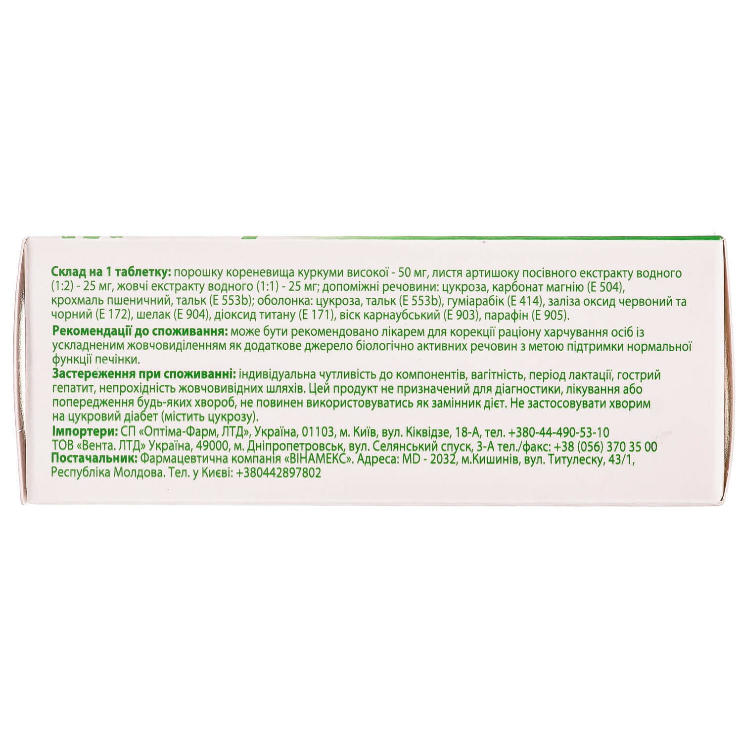- active ingredients: artichoke leaf extract (Extractum siccum Cynarae scolymi) – 25 mg (mg) (equivalent to 750 mg (mg) of fresh artichoke leaves); turmeric powder (Pulvis Curcumae longae) – 50 mg (mg); medicinal bile extract (Extractum chole medicate) – 25 mg (mg);