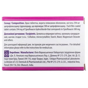 Active ingredient: ciprofloxacin, 1 tablet of 500 mg contains 594 mg of ciprofloxacin hydrochloride, which corresponds to 500 mg of ciprofloxacin.