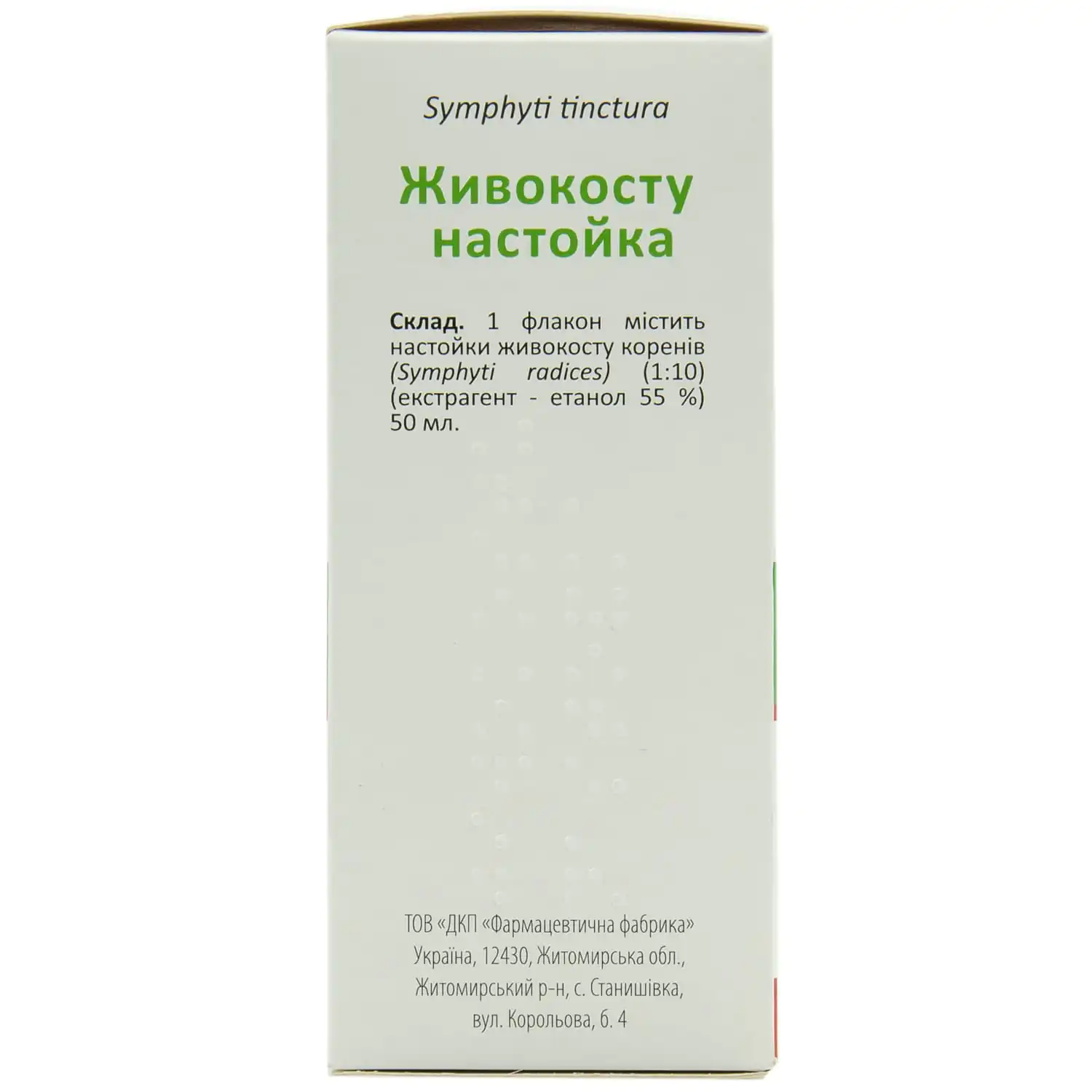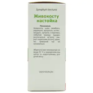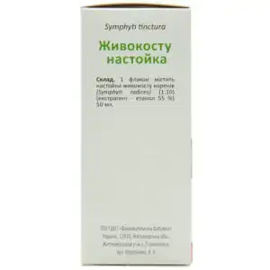 Active ingredient: 1 bottle contains tincture of comfrey roots (symphyti radices) (1:10) (extractant – ethanol 55%) 50 ml.