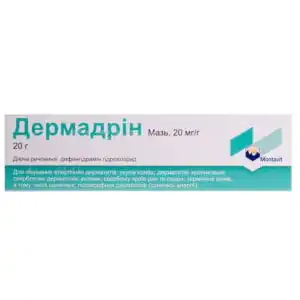 Pharmacodynamics. Dermodrin contains the H1-receptor blocker diphenhydramine, which selectively inhibits histamine H1-receptors. Diphenhydramine is an effective antihistamine that eliminates the manifestations of allergy and itching; additionally has a local anesthetic and analgesic effect. Effectively eliminates swelling and irritation after insect and bee bites, with sun and thermal burns, photodermatosis. The basis of the ointment is a water-oil emulsion, which causes the cooling effect of the drug. When applied topically, the active ingredient of the ointment penetrates the skin and subcutaneous layers. The antipruritic and analgesic effect occurs immediately after applying the ointment and lasts 2-6 hours.