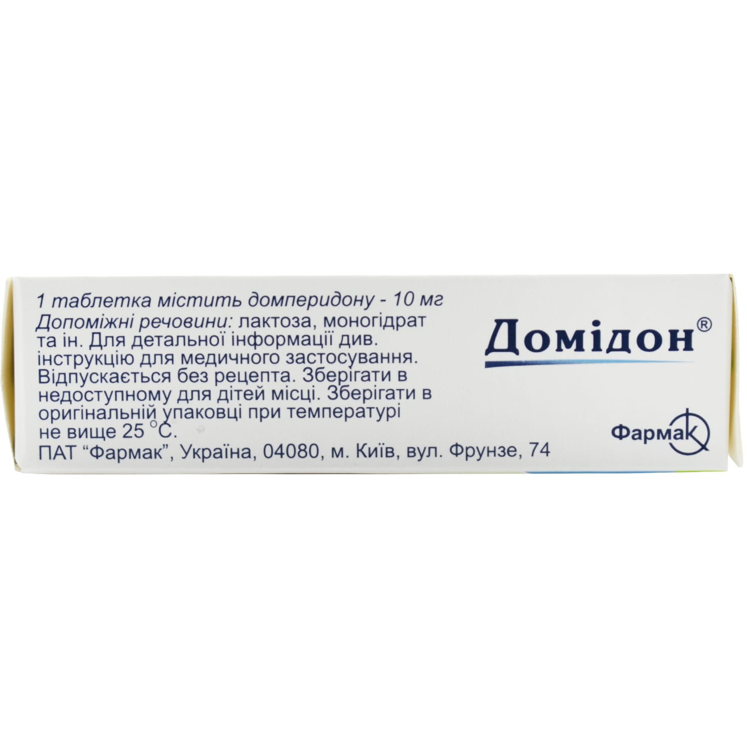Anticholinergic drugs can neutralize the effect of the drug Domidon. The bioavailability of the drug when taken orally is reduced after prior administration of cimetidine or sodium bicarbonate. Antacids and antisecretory drugs should not be taken simultaneously with the drug Domidon, as they reduce its bioavailability after oral administration. The main pathway of metabolic transformations of domperidone occurs with the participation of the isoenzyme CYP 3A4 of the cytochrome P450 system, therefore, with the simultaneous use of domperidone and drugs that significantly inhibit this isoenzyme, an increase in the level of domperidone in the blood plasma is possible. Examples of CYP 3A4 inhibitors include the following drugs: azole antifungals (fluconazole, itraconazole, ketoconazole, voriconazole), macrolide antibiotics (clarithromycin, erythromycin), HIV protease inhibitors (amprenavir, atazanavir, fosamprenavir, indinavir, nelfinavir, ritonavir, saquinavir), calcium antagonists (diltiazem, verapamil), amiodarone, aprepitant, nefazodone, telithromycin.