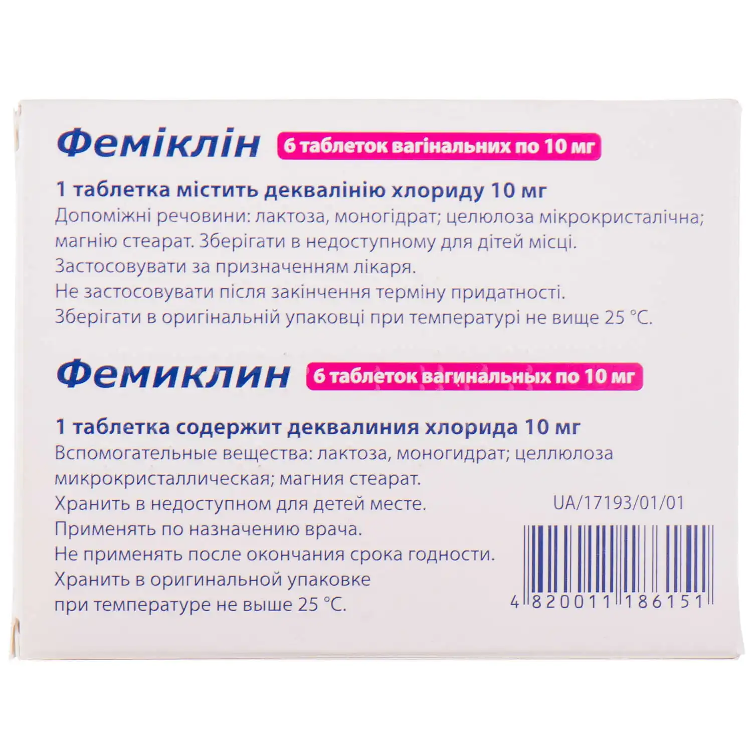 1 vaginal tablet contains 10 mg of dequalinium chloride;