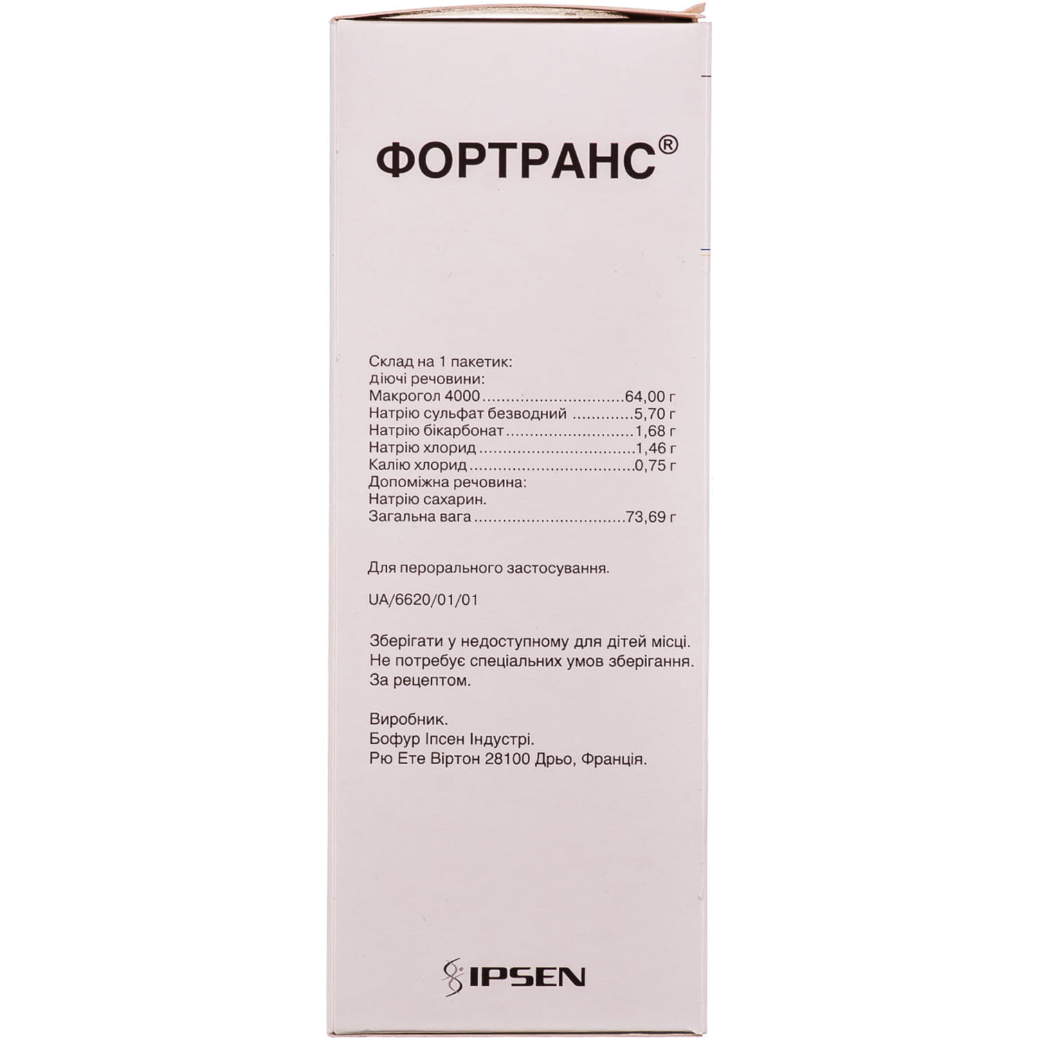 Pharmacodynamics. Due to the formation of hydrogen bonds with water molecules, Fortrans retains it in the intestine. Water fills and increases the contents of the intestine along its entire length. After that, the drug is completely evacuated from the intestine along with its contents.