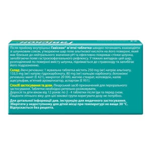 Gaviscon mint tablets. Adults and children over 12 years of age should take 2-4 tablets orally after meals and before bedtime (up to 4 times a day). The tablets should be chewed. The drug should not be used for more than 7 days. If the symptoms of the disease persist or worsen during this period, the patient should consult a doctor to clarify the diagnosis and correct the treatment regimen.