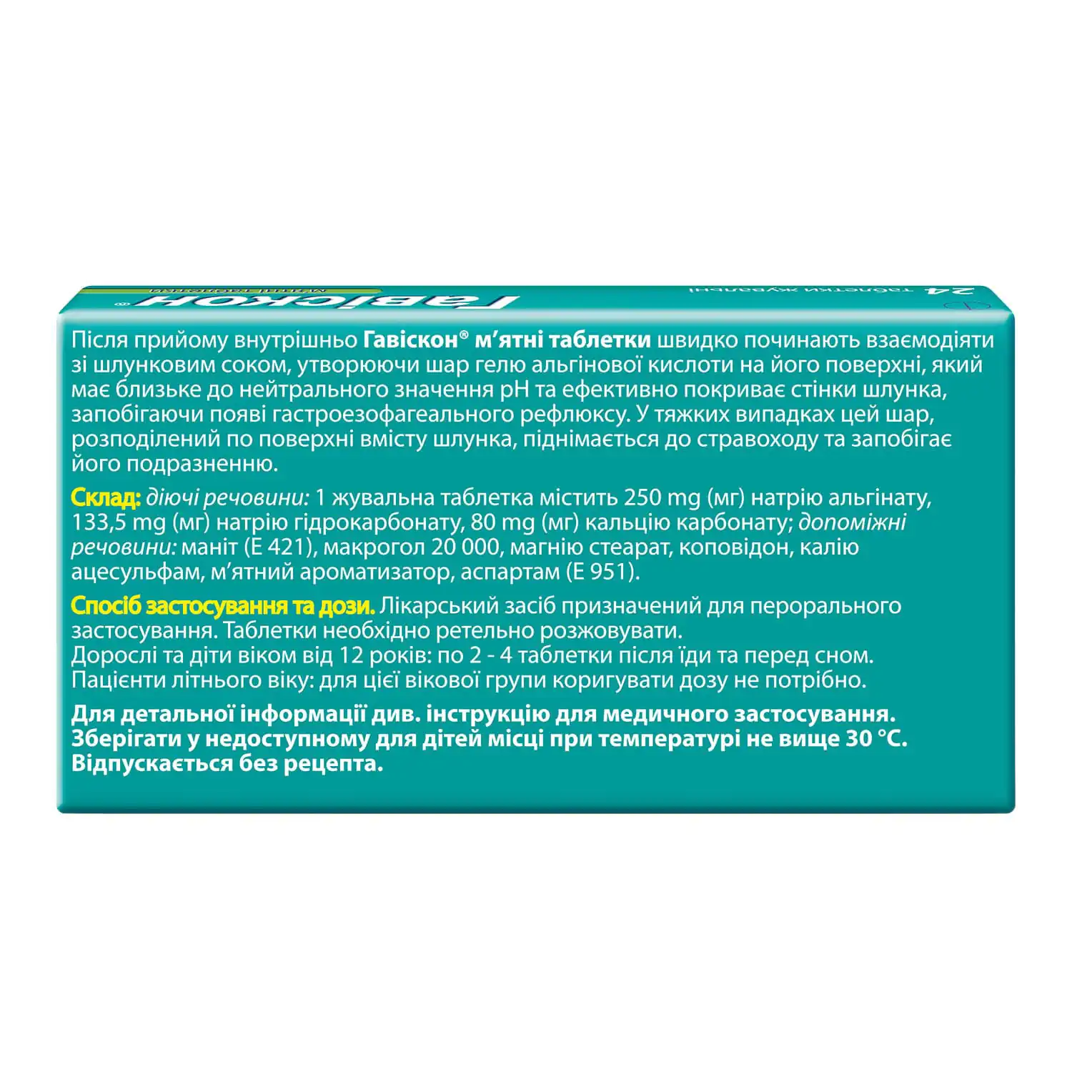 Gaviscon mint tablets. Adults and children over 12 years of age should take 2-4 tablets orally after meals and before bedtime (up to 4 times a day). The tablets should be chewed. The drug should not be used for more than 7 days. If the symptoms of the disease persist or worsen during this period, the patient should consult a doctor to clarify the diagnosis and correct the treatment regimen.