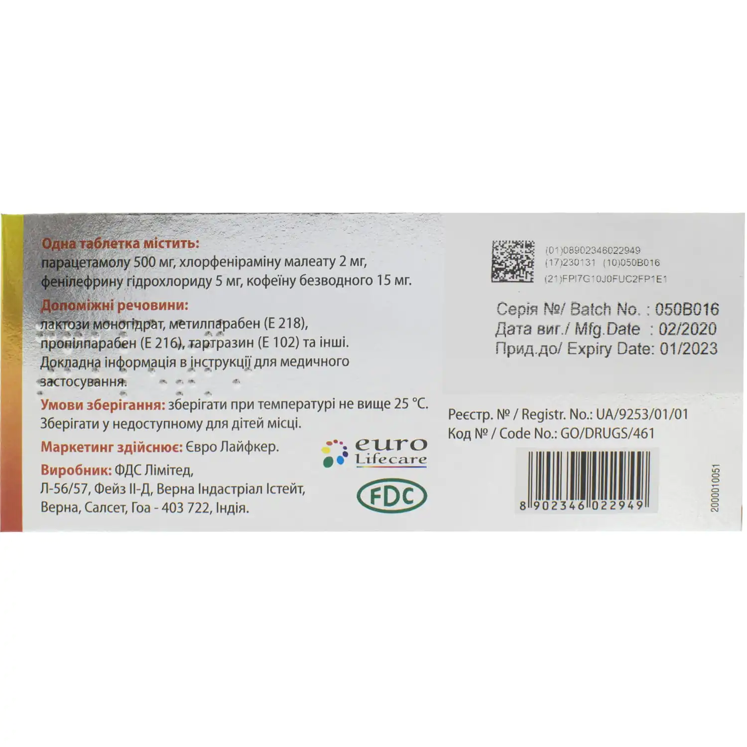 - active ingredients: 1 tablet contains paracetamol 500 mg, chlorpheniramine maleate 2 mg, phenylephrine hydrochloride 5 mg, caffeine anhydrous 15 mg;