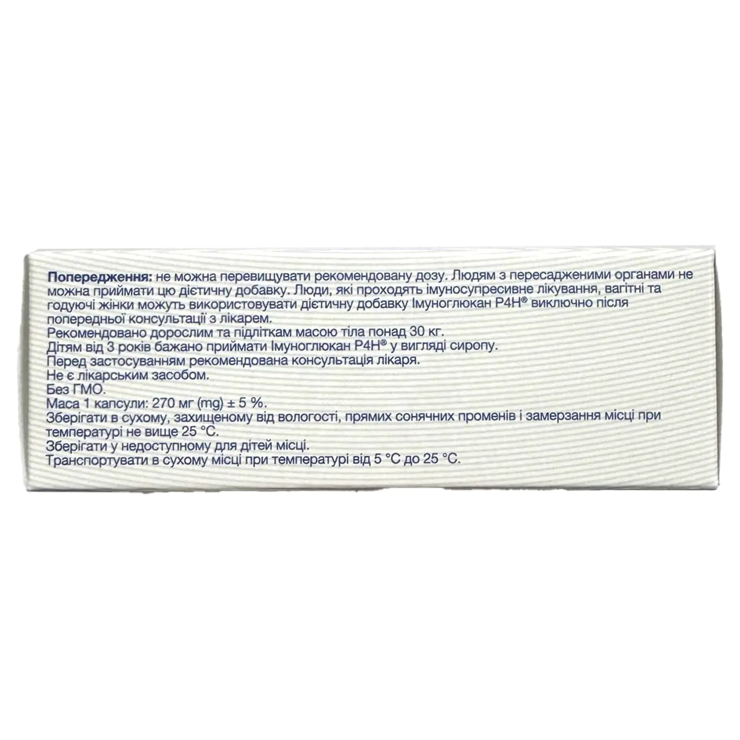 Do not exceed the recommended dose. People with organ transplants should not take this dietary supplement. People undergoing immunosuppressive treatment, pregnant and lactating women may use the dietary supplement Imunoglukan P4H only after prior consultation with a doctor.