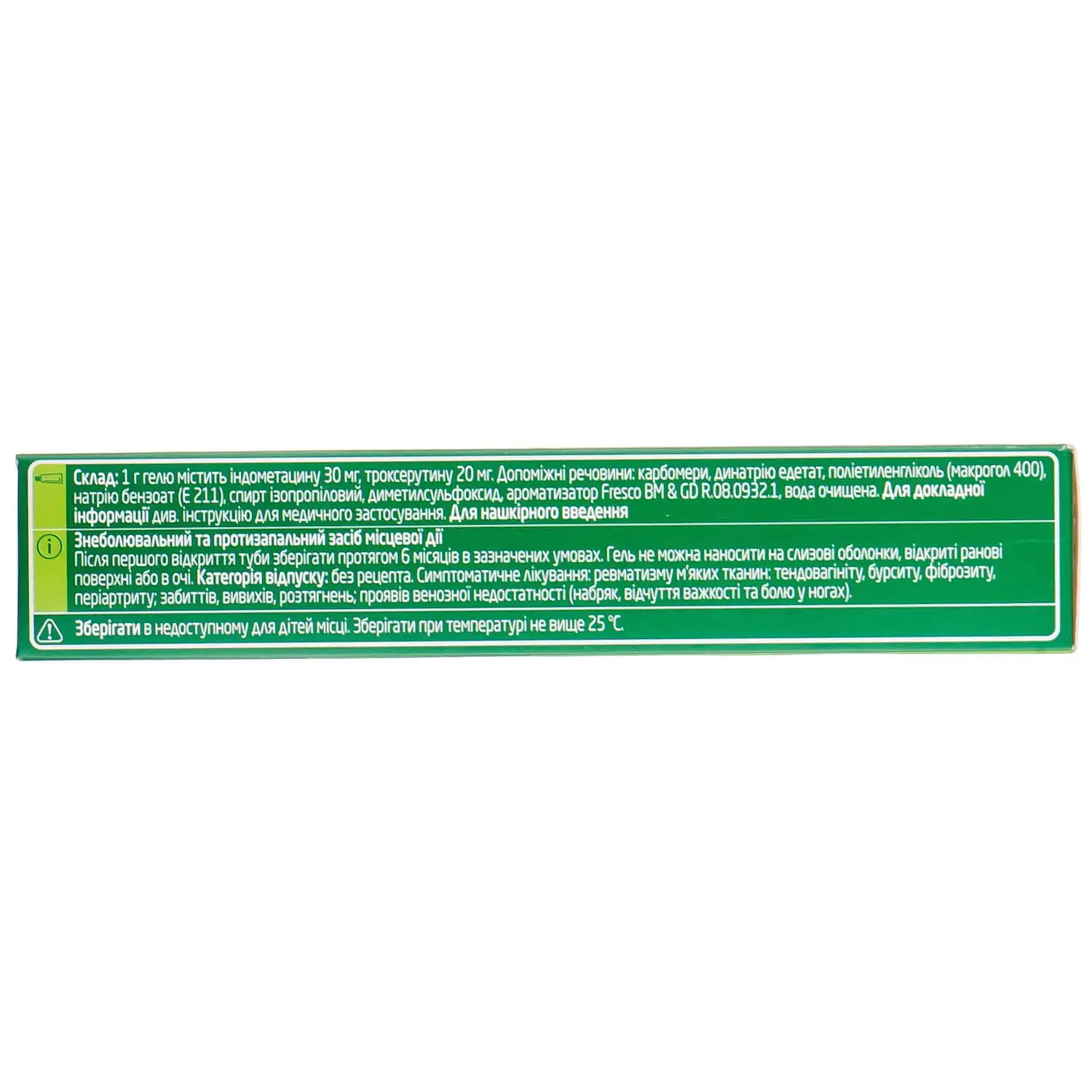 1 g of gel contains indomethacin 30 mg, troxerutin 20 mg;