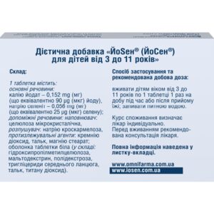 IoSen for children from 3 to 11 years old is recommended as a dietary supplement to the diet as an additional source of iodine and selenium for children aged 3 to 11 years old in order to normalize thyroid function, prevent conditions associated with iodine and selenium deficiency, as well as to enrich the diet of children living in regions with insufficient iodine in the environment.