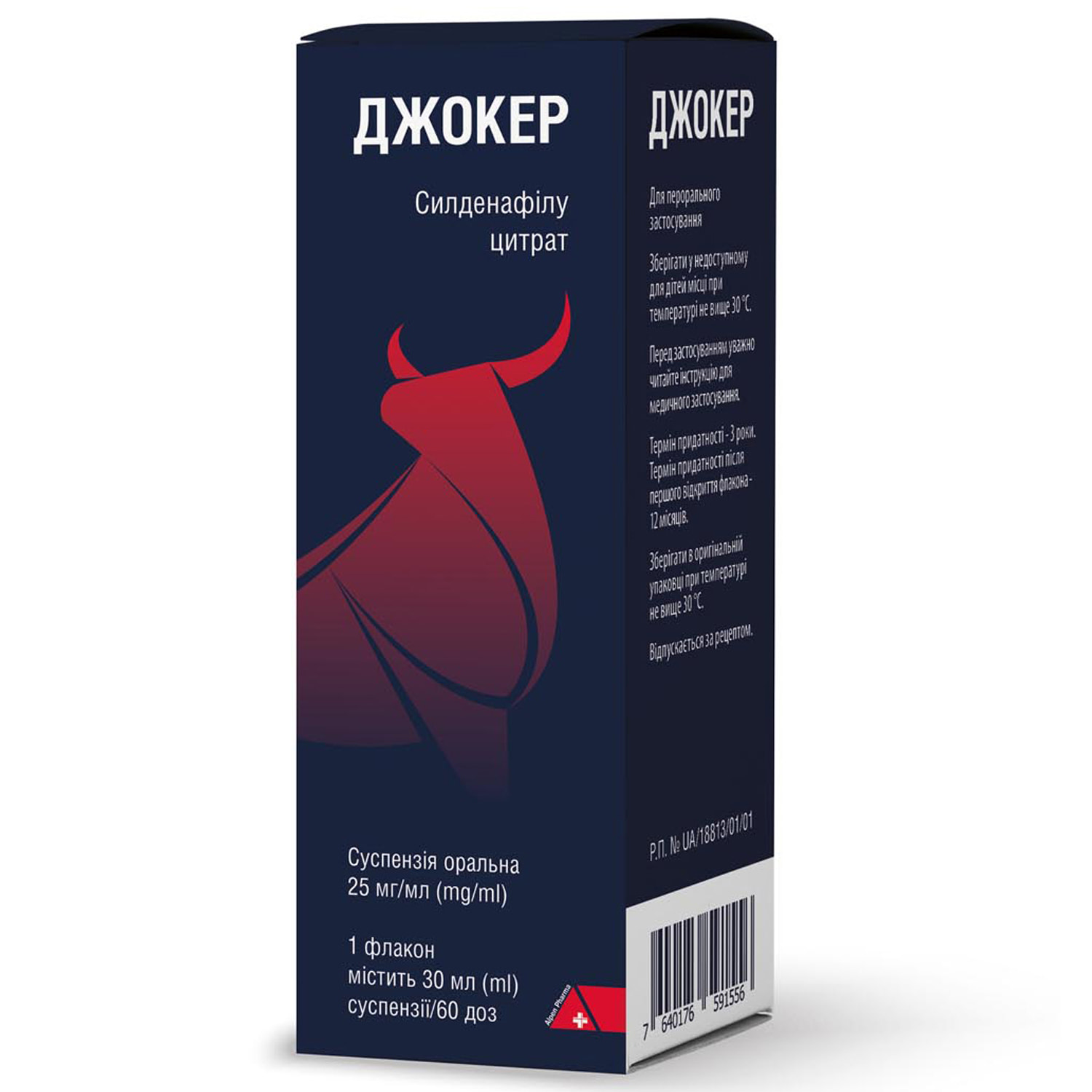 Joker is a medicine for erectile dysfunction in men. It contains sildenafil, a selective inhibitor of the enzyme phosphodiesterase-5, which increases the natural blood flow to the penis. The drug is taken orally in the form of a mint-flavored suspension, and its effect is manifested only in the presence of sexual arousal. The duration of the effect is usually about 4 hours, and the onset of action is 30-60 minutes after taking.