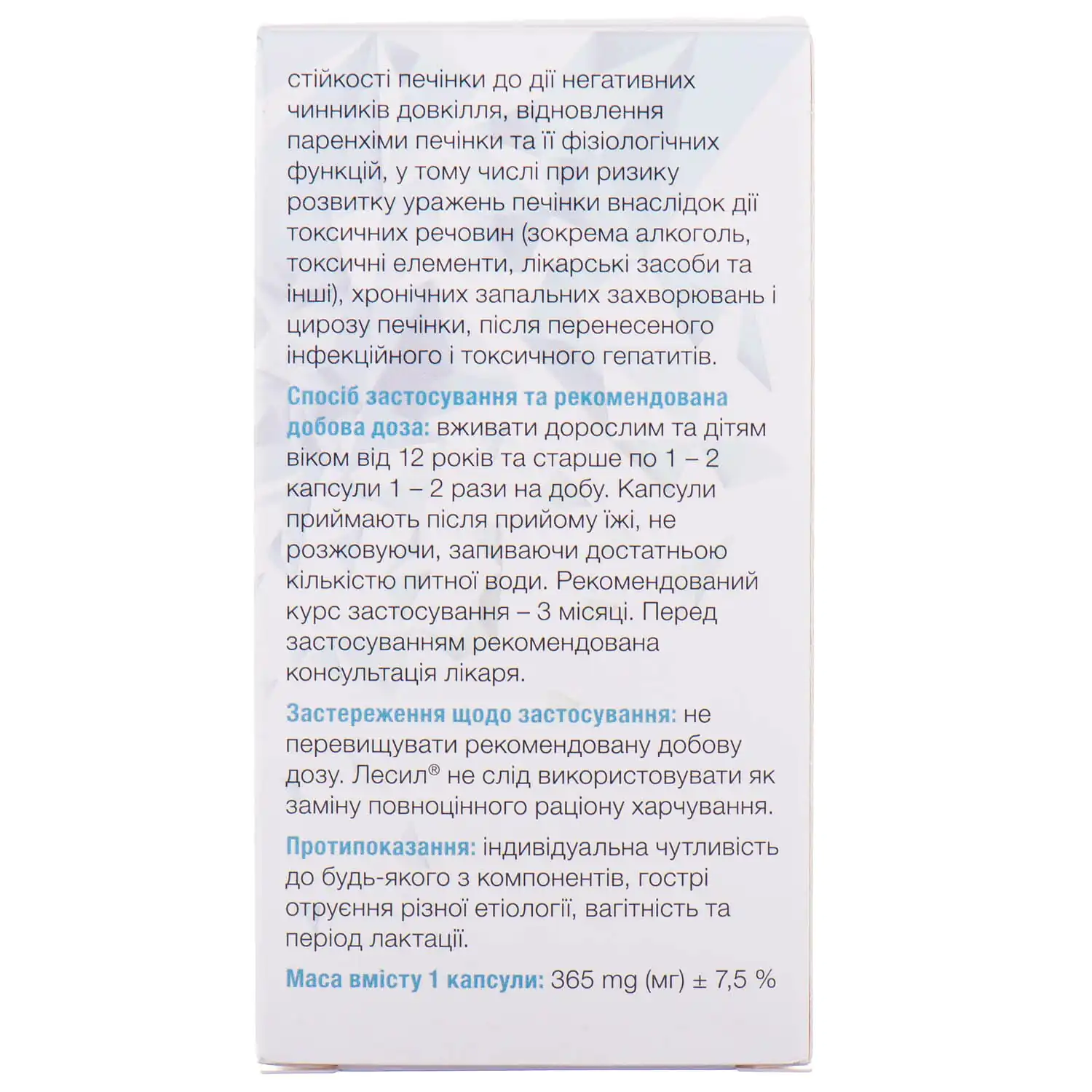 “Lesil” is recommended as an additional source of silibinin, phospholipids, phosphatidylcholine in order to normalize the functional state of the digestive system: increasing the liver’s resistance to the effects of negative environmental factors, restoring the liver parenchyma and its physiological functions, including at risk of developing liver damage due to exposure to toxic substances (including alcohol, toxic elements, drugs, and others), chronic inflammatory diseases and liver cirrhosis, after infectious and toxic hepatitis.