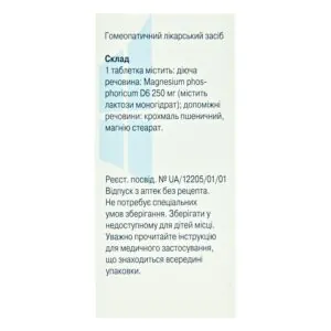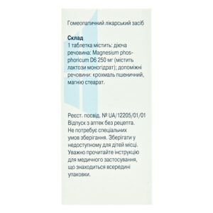 Active ingredient: 1 tablet contains Magnesium phosphoricum D6 250 mg (contains lactose monohydrate);