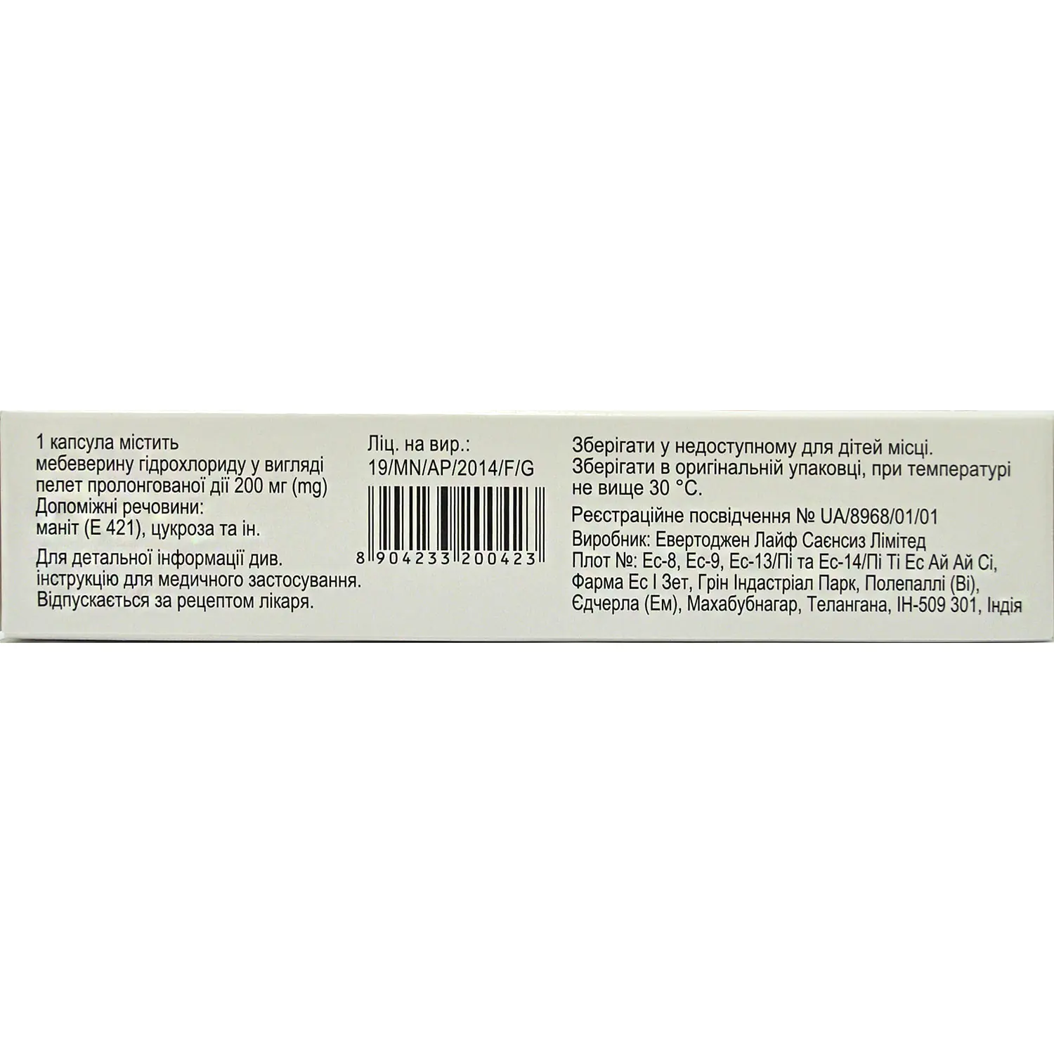 1 capsule contains 200.0 mg of mebeverine hydrochloride in the form of prolonged-release pellets;