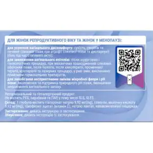 After intravaginal application of the product, a moisturizing protective coating is formed on the vaginal mucosa, which protects the vaginal epithelium from mechanical damage and helps reduce discomfort associated with the feeling of dryness, tension, itching and burning of the vaginal mucosa.