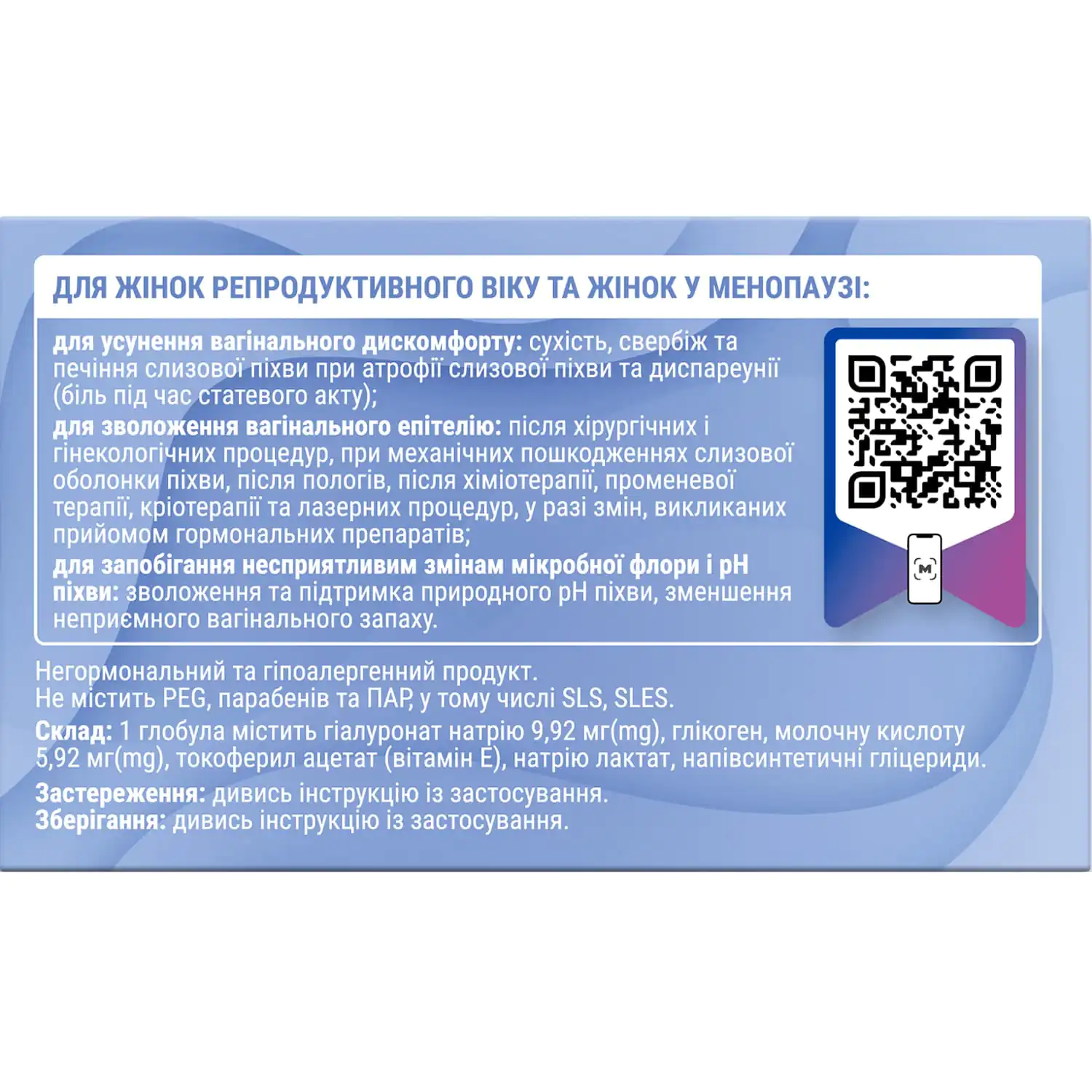 1 globule contains: sodium hyaluronate, glycogen, lactic acid, tocopheryl acetate (Vitamin E), sodium lactate, semi-synthetic glycerides.