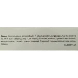 - 1 tablet contains metronidazole, calculated as 100% metronidazole content 250 mg;