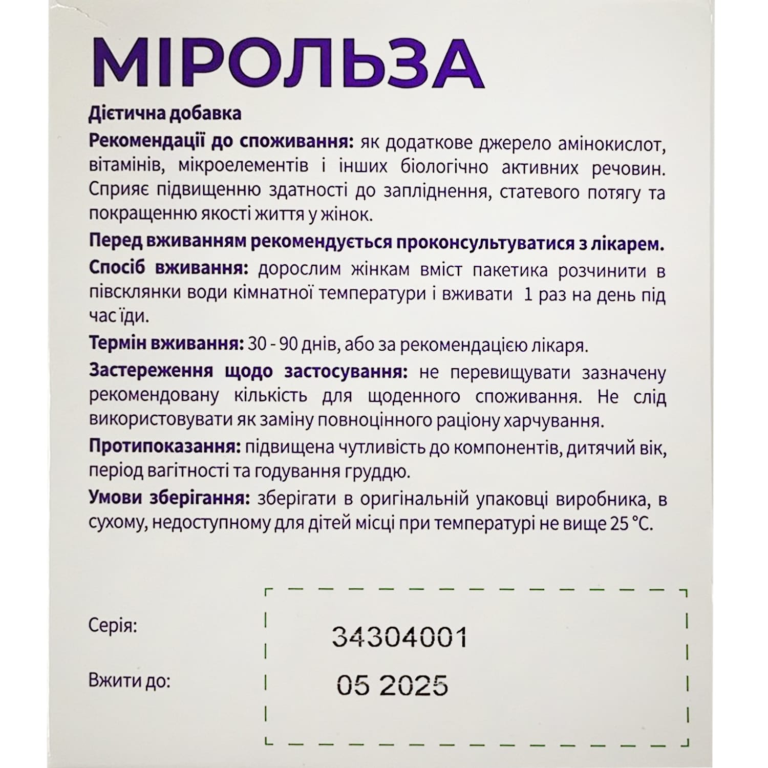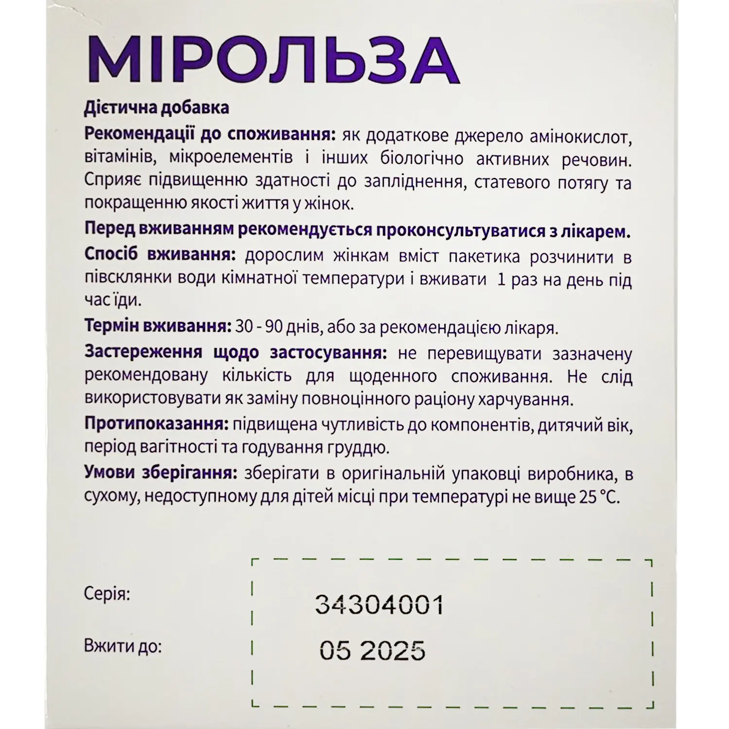 Mirolza is a dietary supplement containing an additional source of amino acids, vitamins, trace elements and other biologically active substances. It helps to increase fertility, sexual desire and improve the quality of life in women.