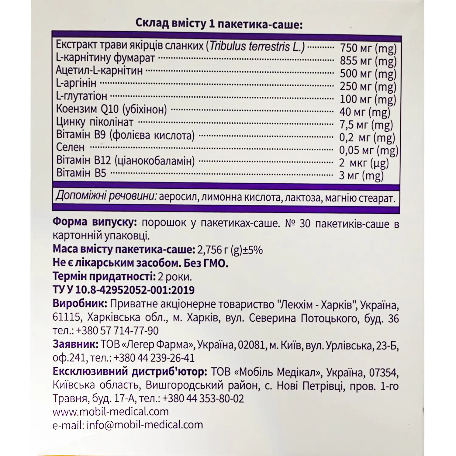 1 sachet: Tribulus terrestris L. herb extract – 750 mg (mg), L-carnitine fumarate – 855 mg (mg), acetyl-L-carnitine – 500 mg (mg), L-arginine – 250 mg (mg), L-glutathione – 100 mg (mg), coenzyme Q10 (ubiquinone) – 40 mg (mg), zinc picolinate – 7.5 mg (mg), vitamin B9 (folic acid) – 0.2 mg (mg), selenium – 0.05 mg (mg), vitamin B12 (cyanocobalamin) – 2 μg (μg), vitamin B5 – 3 mg (mg).