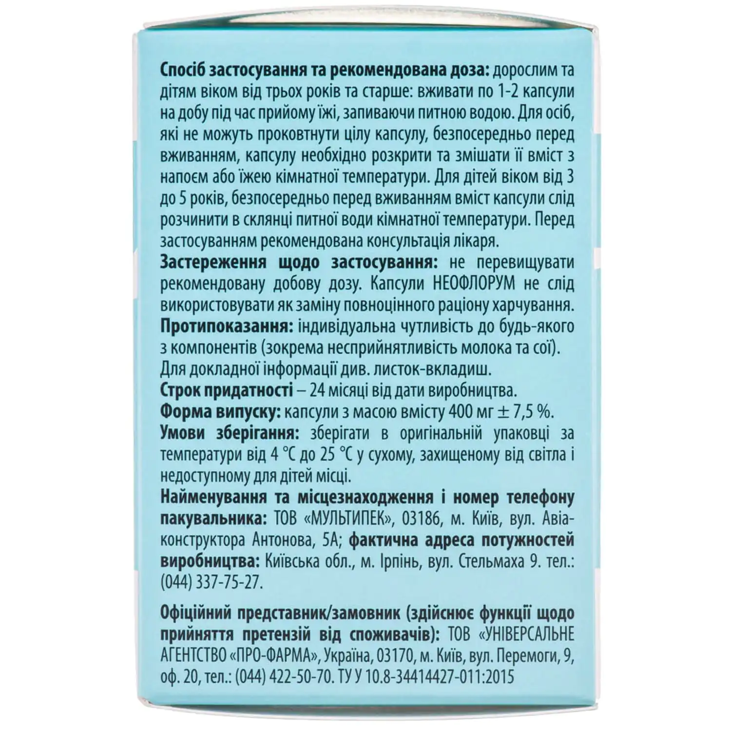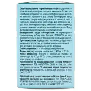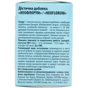 - Improves intestinal microflora thanks to lacto- and bifidobacteria. Neoflorum contains a high concentration of beneficial bacteria, namely: Bifidobacterium longum, Lactobacillus helveticus, Lactobacillus rhamnosus) no less than 5 x 109 CFU, due to which Neoflorum only needs to be taken 1-2 capsules per day.