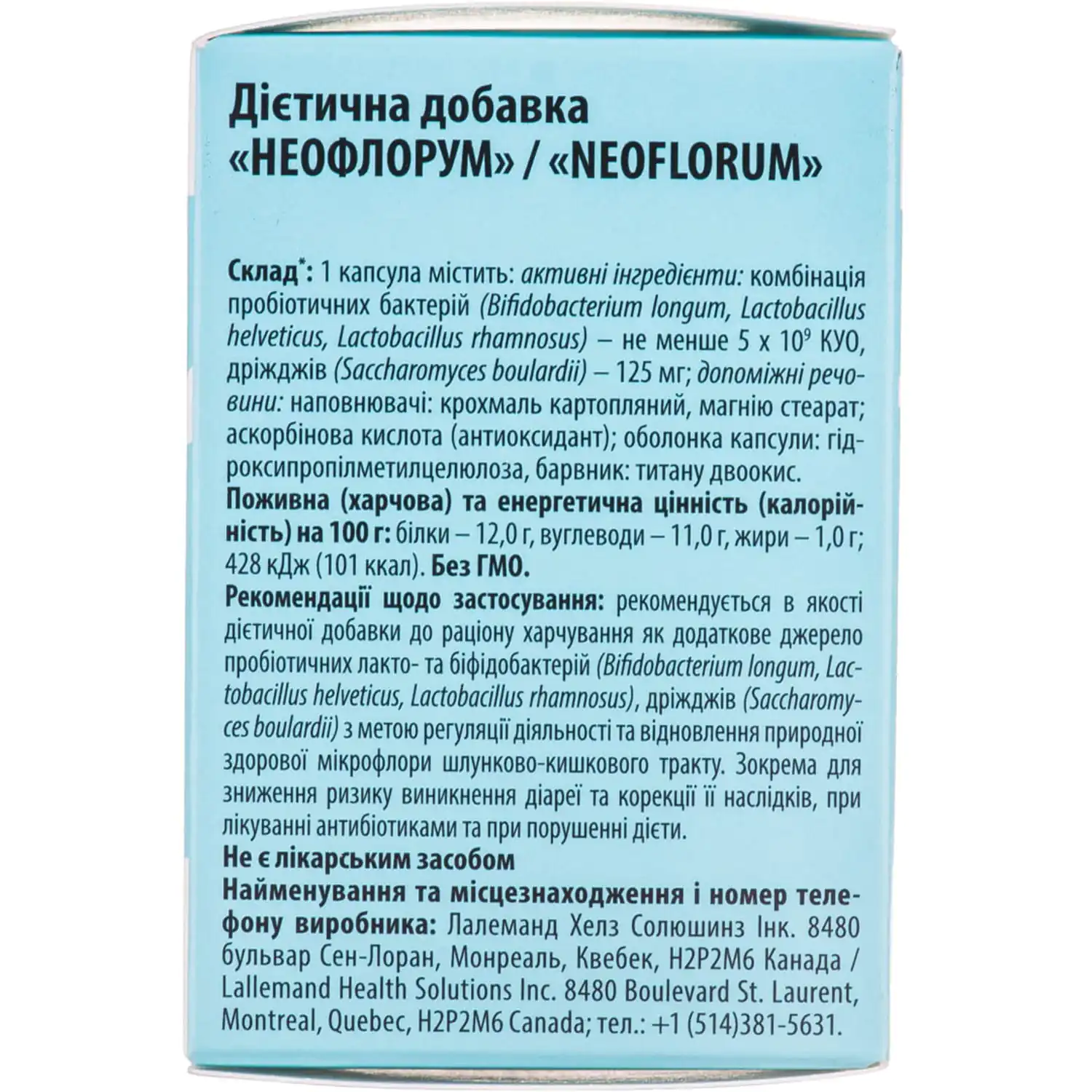 Neoflorum capsules are made in Canada by Lalemand HEALTH Solutions, which has been producing probiotics for over 100 years and is a recognized leader and trendsetter in probiotic production.