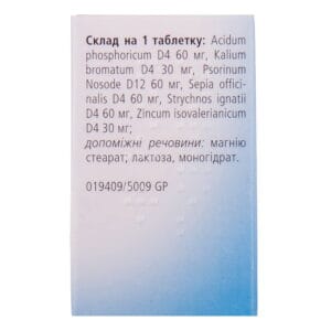 active ingredients: 1 tablet contains: Acidum phosphoricum D4 – 60 mg, Kalium bromatum D4 – 30 mg, Psorinum Nosode D12 – 60 mg, Sepia officinalis D4 – 60 mg, Strychnos ignatii D4 – 60 mg, Zincum isovalerianicum D4 – 30 mg;