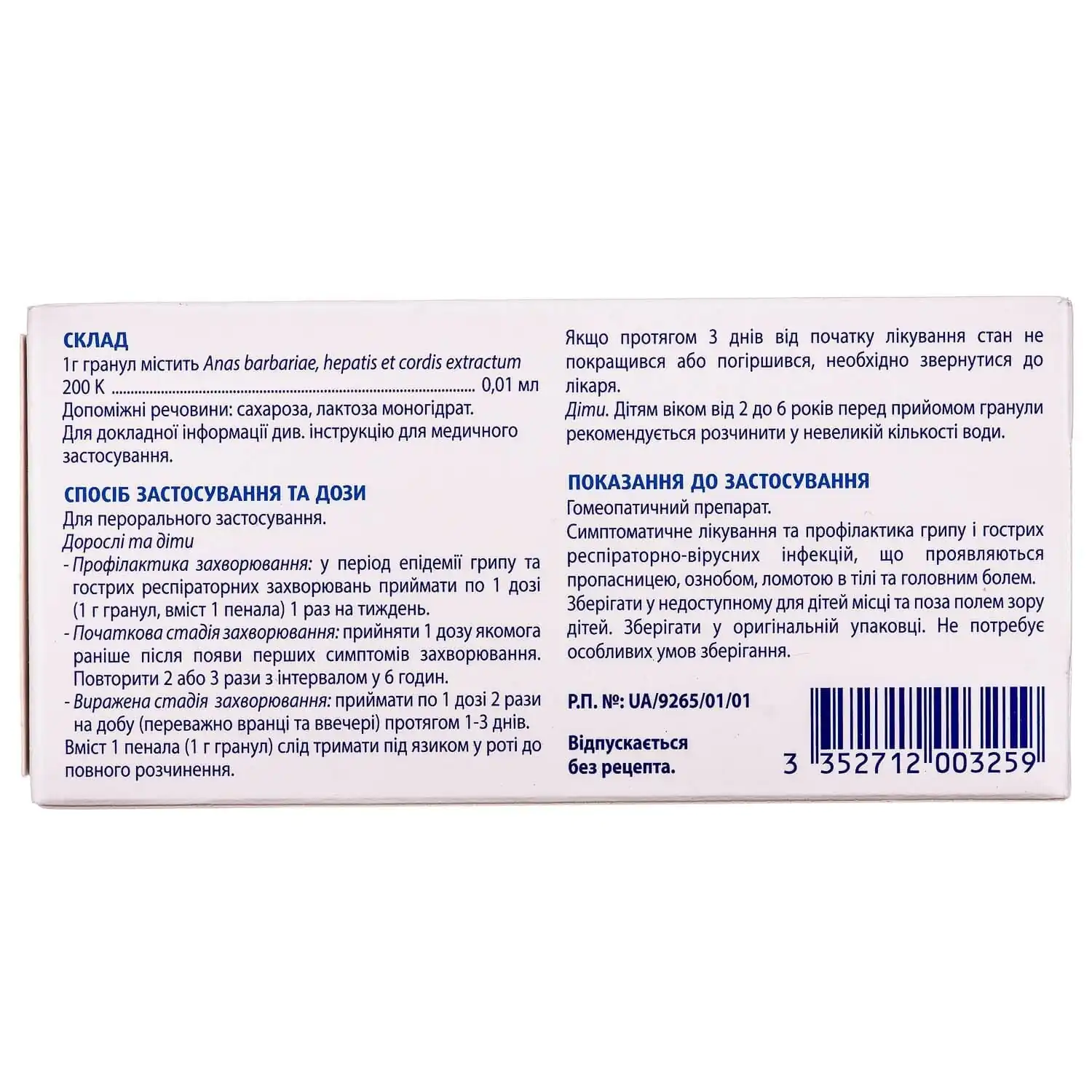 - active ingredient: 1 g of granules contains Anas barbariae, hepatis et cordis extractum 200K–0.01 ml;