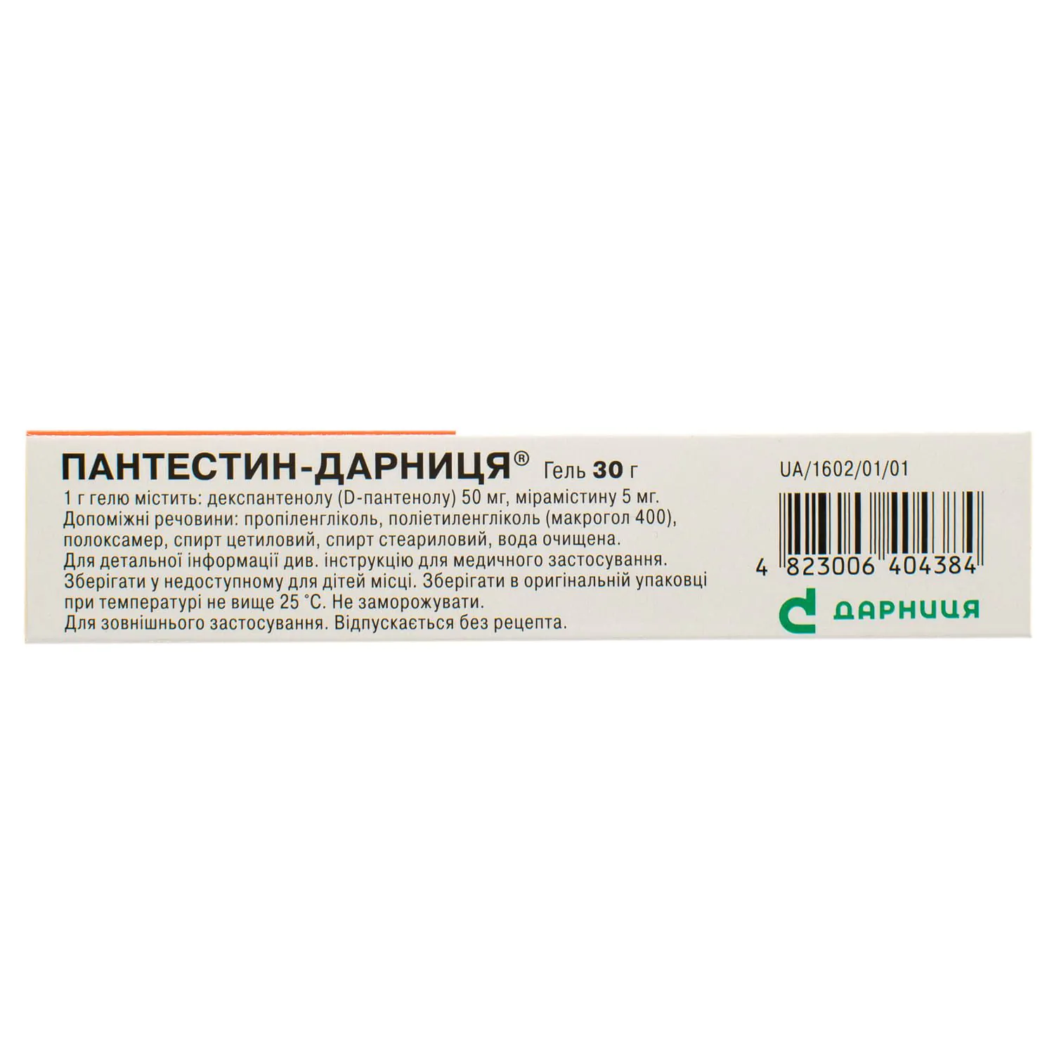 Pharmacodynamic parameters. Pantestin Darnytsia gel contains two pharmaceutical active ingredients: dexpanthenol and miramistin.