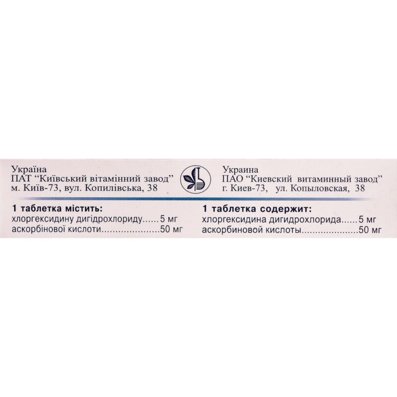 • active ingredients: 1 tablet contains chlorhexidine dihydrochloride 5 mg, ascorbic acid 50 mg;