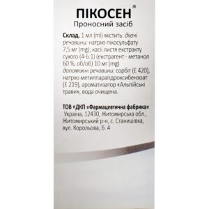 PICOSEN is a combined contact laxative. Sodium picosulfate is a local laxative of the triarylmethane group, which, after bacterial cleavage in the colon, stimulates its mucous membrane, accelerating peristalsis, and promotes the accumulation of water and electrolytes in the lumen of the colon. The result is stimulation of defecation, reduction of transit time, and softening of feces.