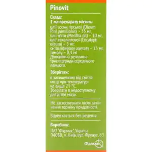 Active ingredients: 1 ml of the drug contains mountain pine oil (Oleum Pini pumilionis) 35 mg, mint oil (Mentha oil) 10 mg, eucalyptus oil (Eucalypti oleum) 5 mg, α-tocopherol acetate 15 mg, thymol 0.3 mg;