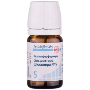 The name contains the action of the testimony of Dr. Schuessler’s salt No. 5 potassium phosphoricum potassium phosphate (kalium phosphoricum) is the most important inorganic mineral salt in cells and is especially necessary for blood plasma, brain, nervous system and muscle cells mineral salt of the central and peripheral nervous system. it helps to balance the psycho-emotional state and stabilizes the functioning of the nervous system is used to treat conditions of general weakness, mental, emotional and physical exhaustion, as well as as a supportive therapy for depression