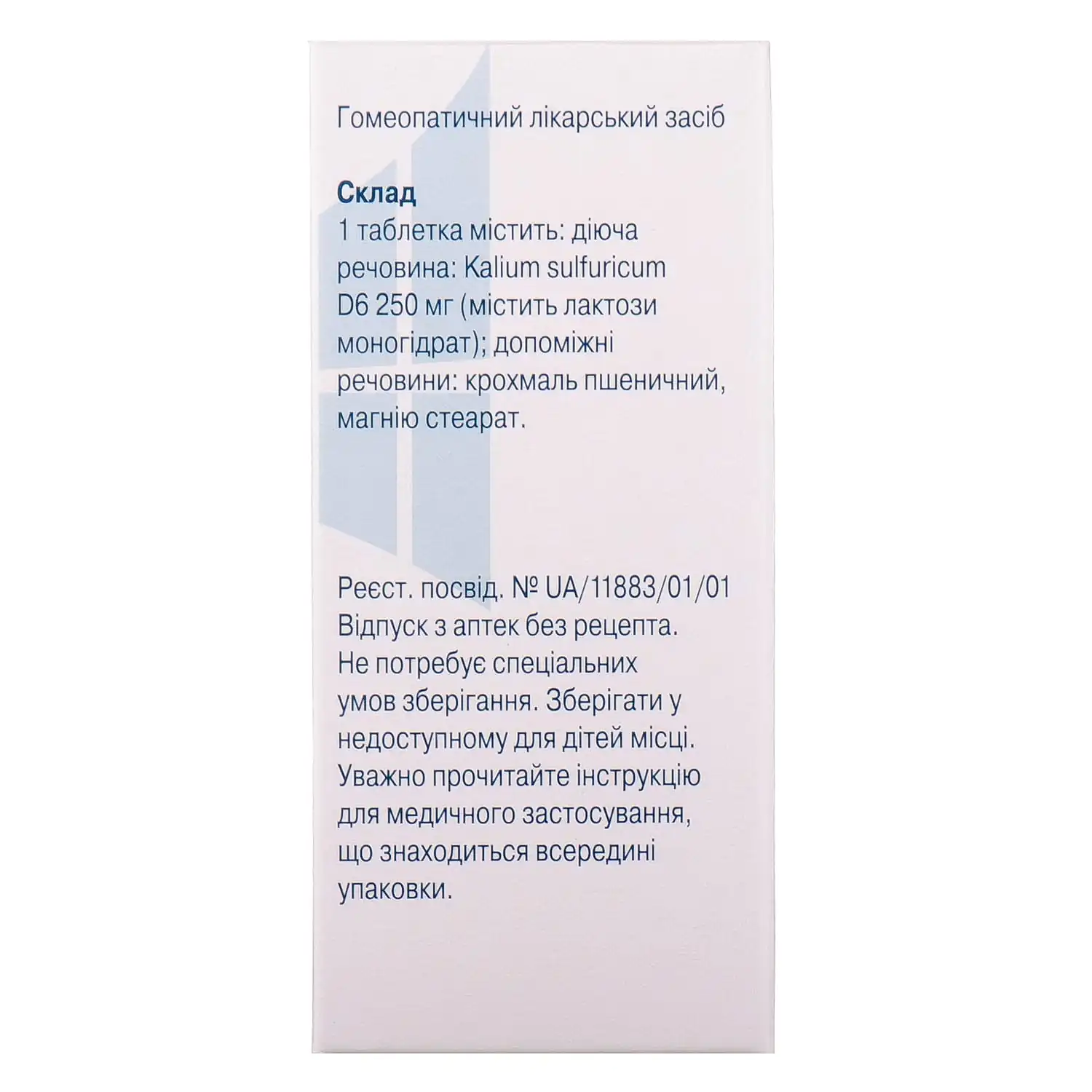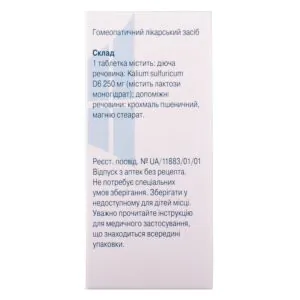 Active ingredient: 1 tablet contains Kalium sulfuricum D6 250 mg (contains lactose monohydrate);