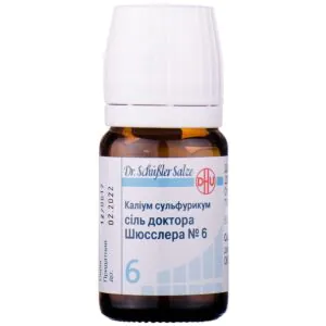 Tablets of potassium sulfuricum salt of Dr. Schussler No. 6 are used to reduce the severity of chronic inflammation and chronic skin diseases. For rapid healing of wounds with slow granulation and activation of the healing process in inflammation of the mucous membranes of the oral and nasal cavities, pharynx and mucous membranes of the eyes.