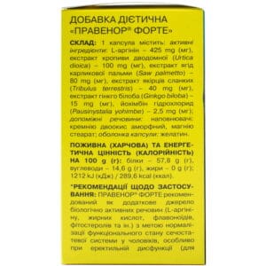 Pravenor Forte is recommended as an additional source of biologically active substances (L-arginine, fatty acids, flavonoids, phytosterols, and others).