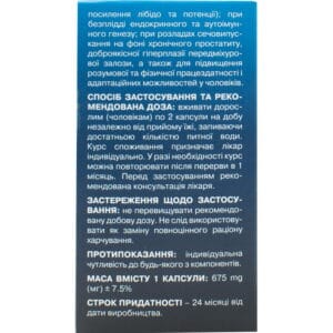 Adults (men) should take 2 capsules per day, regardless of meals, with a sufficient amount of drinking water. The duration of use is determined individually by a healthcare professional. If necessary, the course may be repeated after a 1-month break. Consultation with a doctor is recommended before use.
