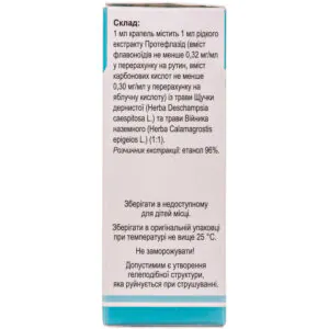 1 ml of drops contains 1 ml of liquid extract Proteflazid (flavonoid content of at least 0.32 mg/ml in terms of rutin, carboxylic acid content of at least 0.30 mg/ml in terms of malic acid) from the grass of Sodden Pike (Herba Deschampsia caespitosa L.) and the grass of Ground Warbler (Herba Calamagrostis epigeios L.) (1:1).