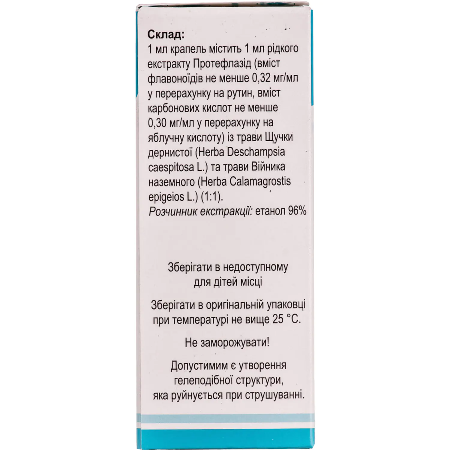 1 ml of drops contains 1 ml of liquid extract Proteflazid (flavonoid content of at least 0.32 mg/ml in terms of rutin, carboxylic acid content of at least 0.30 mg/ml in terms of malic acid) from the grass of Sodden Pike (Herba Deschampsia caespitosa L.) and the grass of Ground Warbler (Herba Calamagrostis epigeios L.) (1:1).