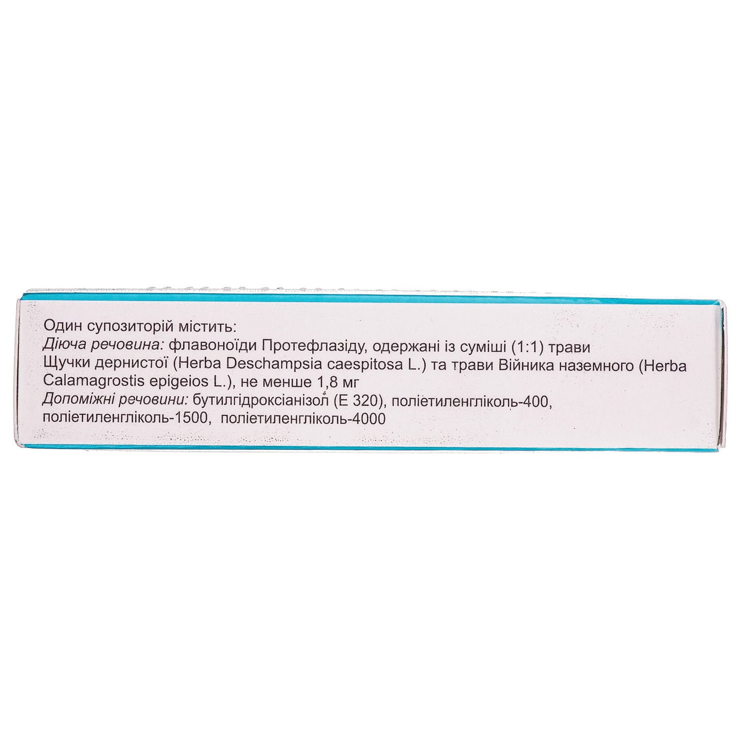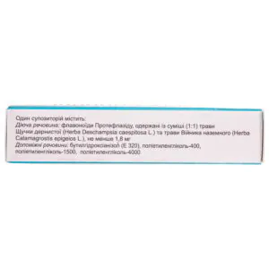1 suppository contains (active ingredient) flavonoids Proteflazid, obtained from a mixture (1: 1) of the grass Deschampsia caespitosa (Herba Deschampsia caespitosa L.) and the grass Calamagrostis epigeios (Herba Calamagrostis epigeios L.) – not less than 1.8 mg.