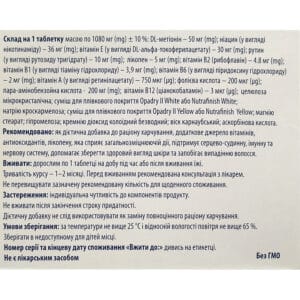 Excipients: microcrystalline cellulose, Opadry II White or Nutrafinish White coating blend, sodium croscarmellose, Opadry II Yellow or Nutrafinish Yellow coating blend, magnesium stearate, hypromellose, colloidal silicon dioxide, carnauba wax, ascorbic acid.